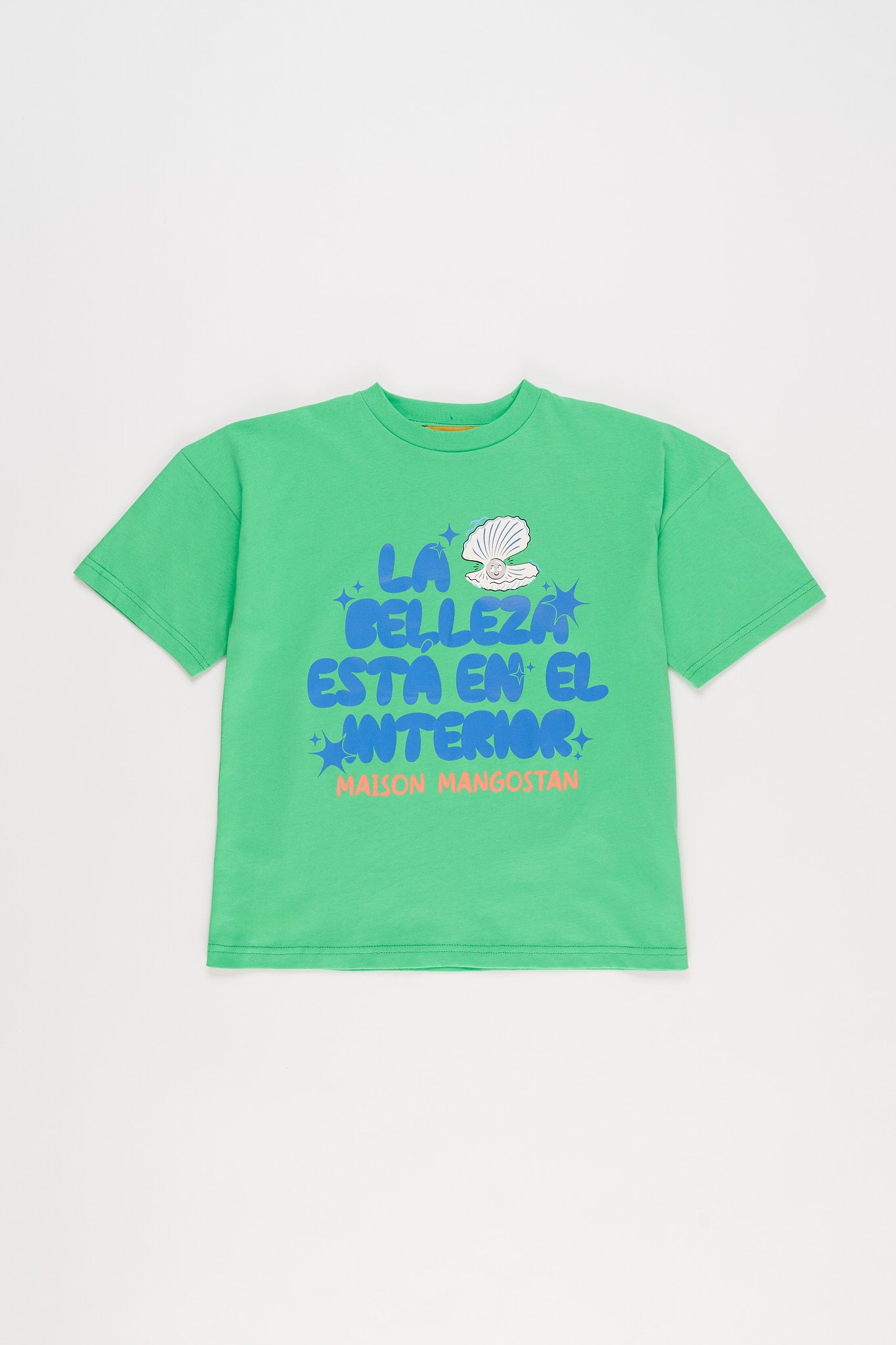 BEAUTY IS IN THE INSIDE 美は内にある。とスペイン語で書かれたTシャツ。真珠貝のキャラクターがかわいい。
