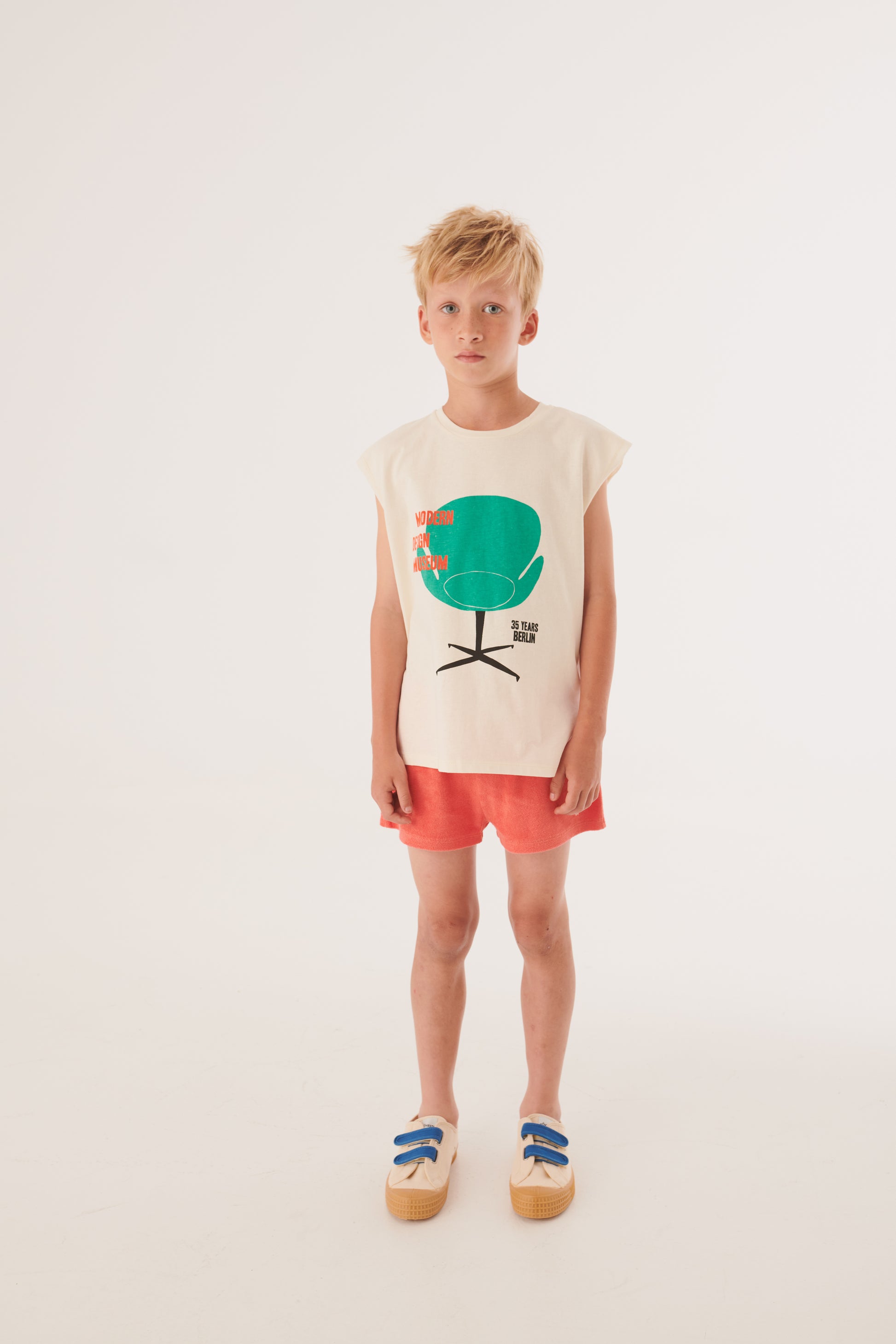 肌触りの良いオーガニックコットン素材のジャージー生地。modern design museumと書かれたミュージアムTシャツ設定もの。椅子プリントが存在感抜群。アートを感じるTシャツ。