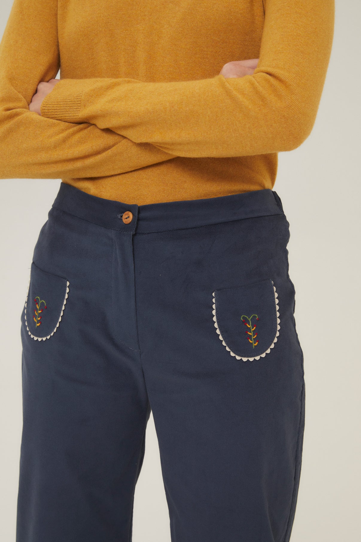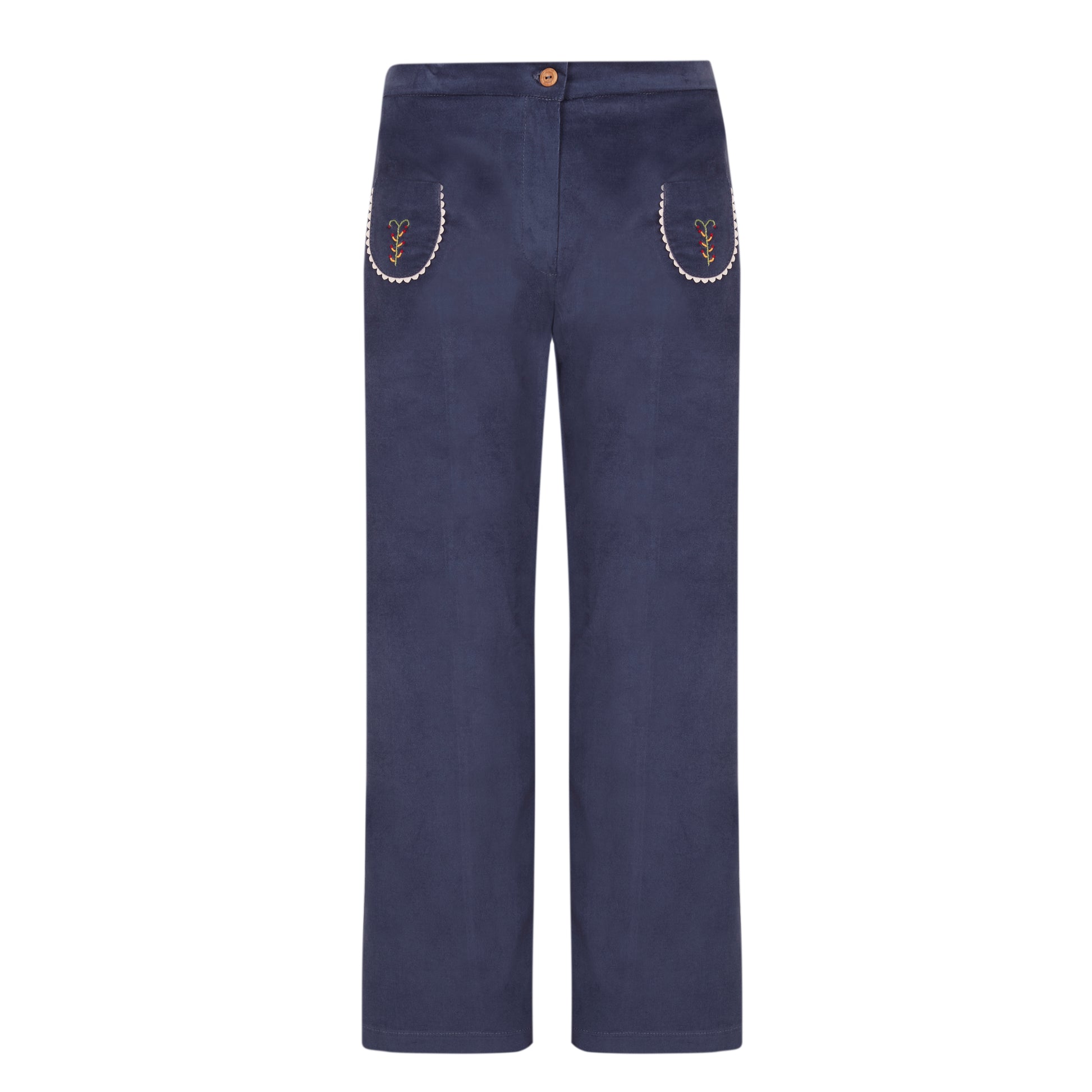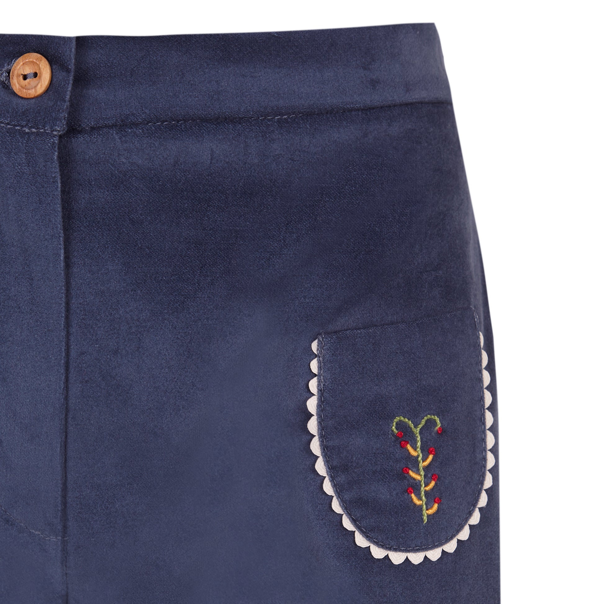 [adult]WOMAN COBALT BLUE VELVET EMBROIDERED BELL BOTTOM PANTS
