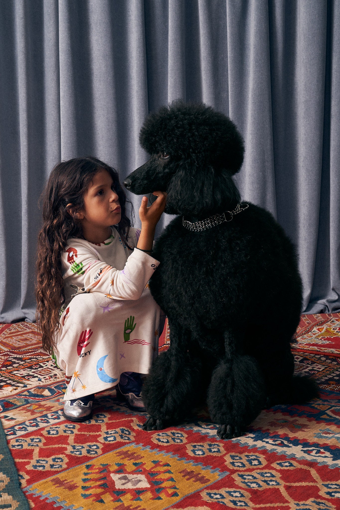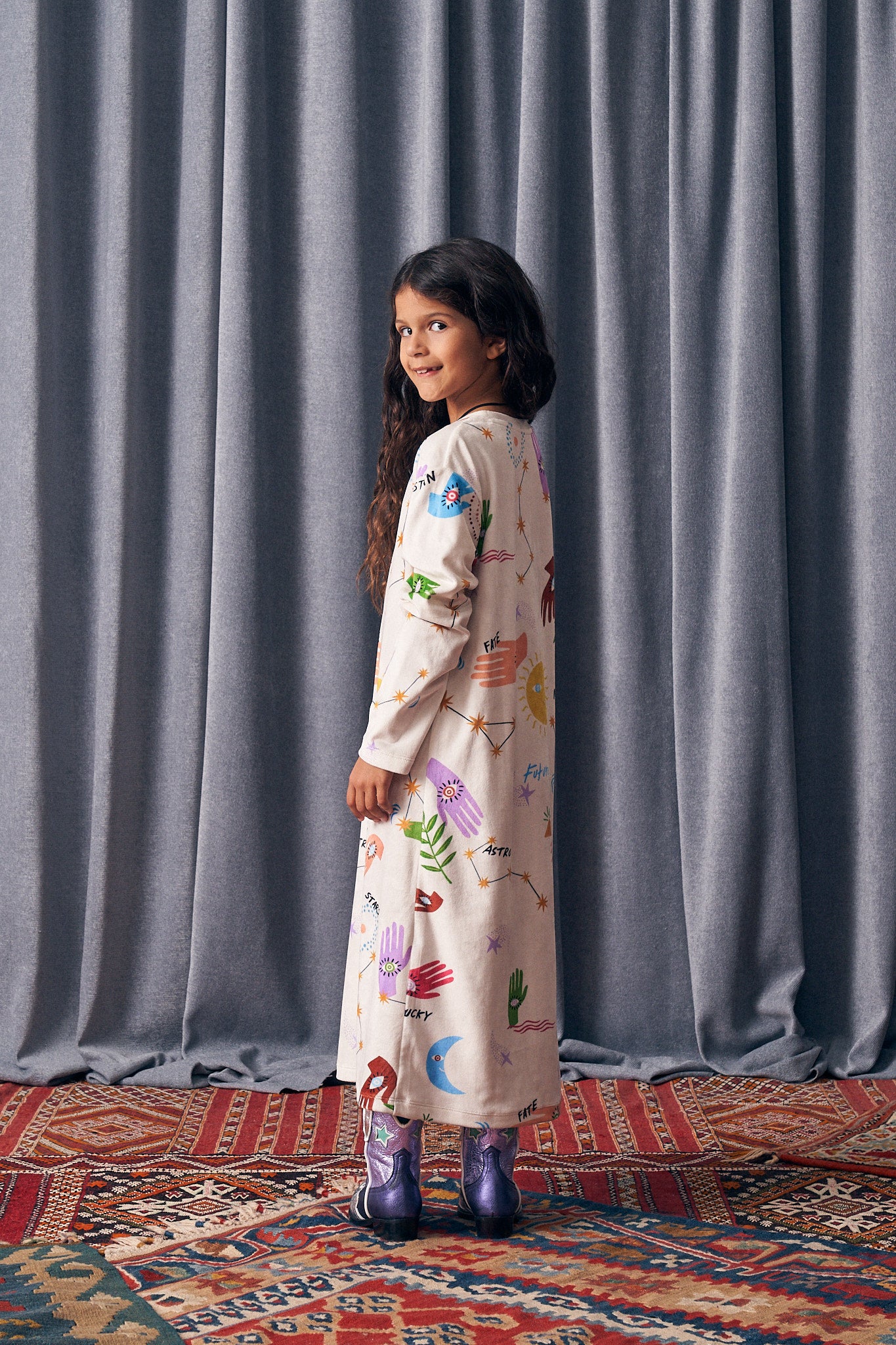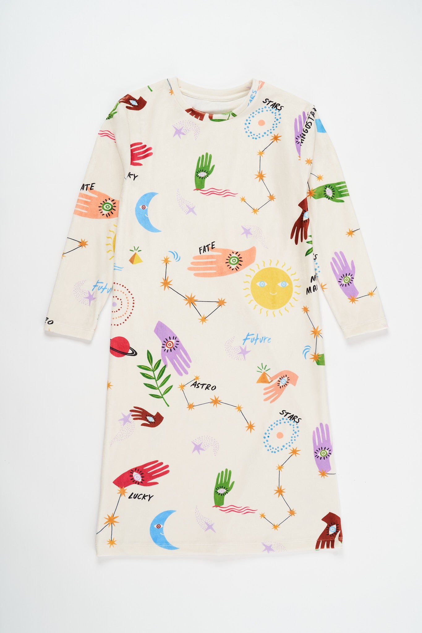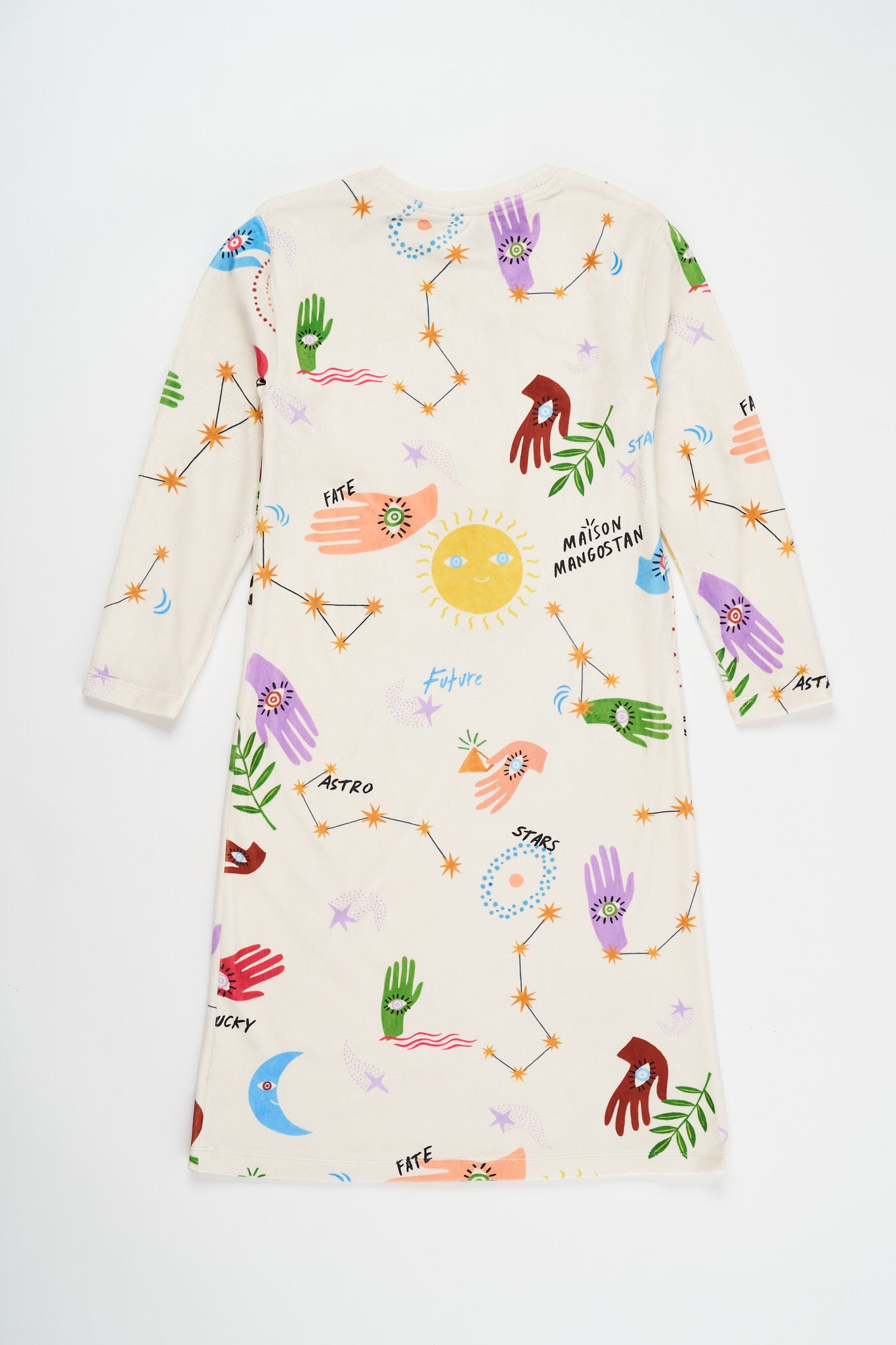 ベルベット素材のワンピース。 星座や天空にちなんだアストロプリントが新鮮!