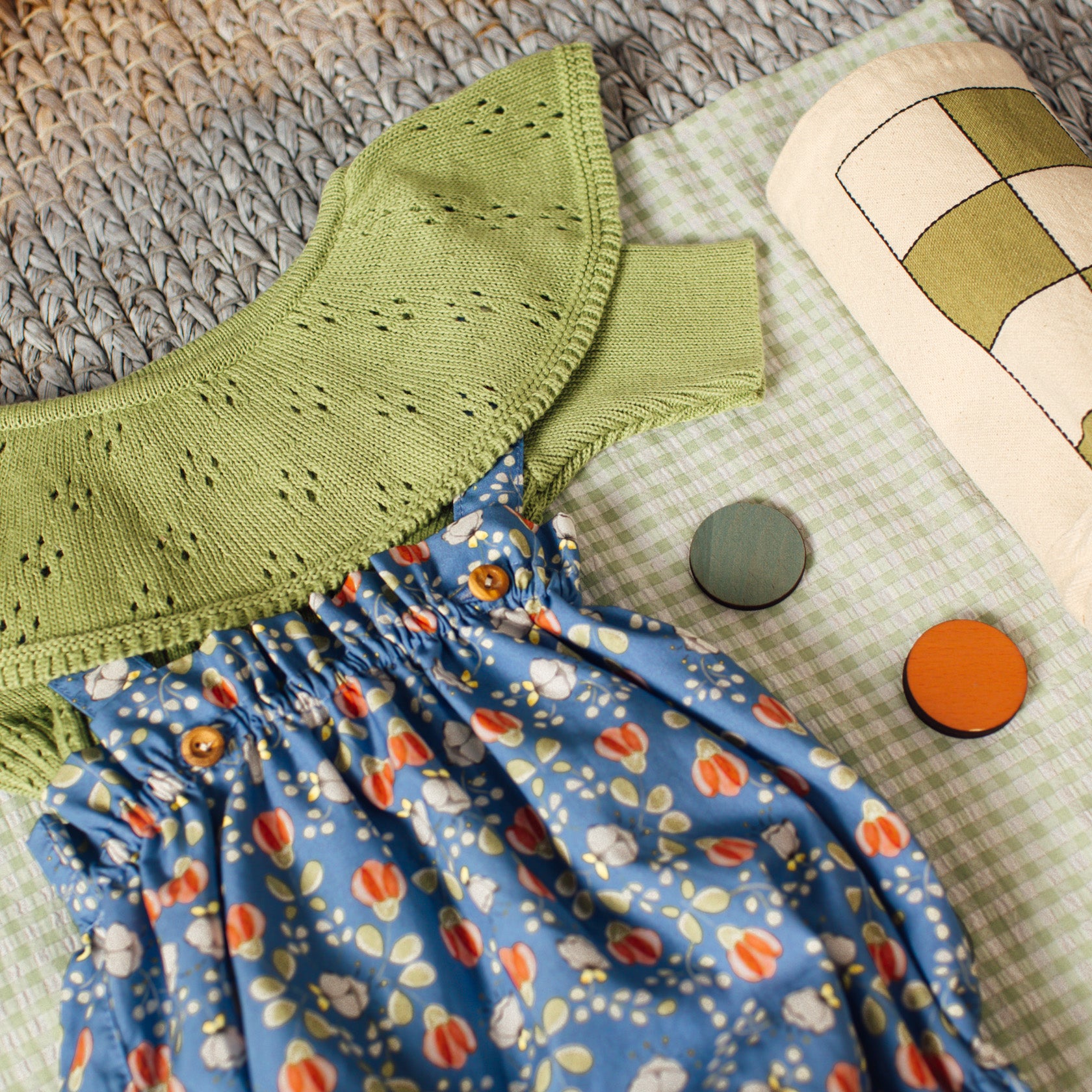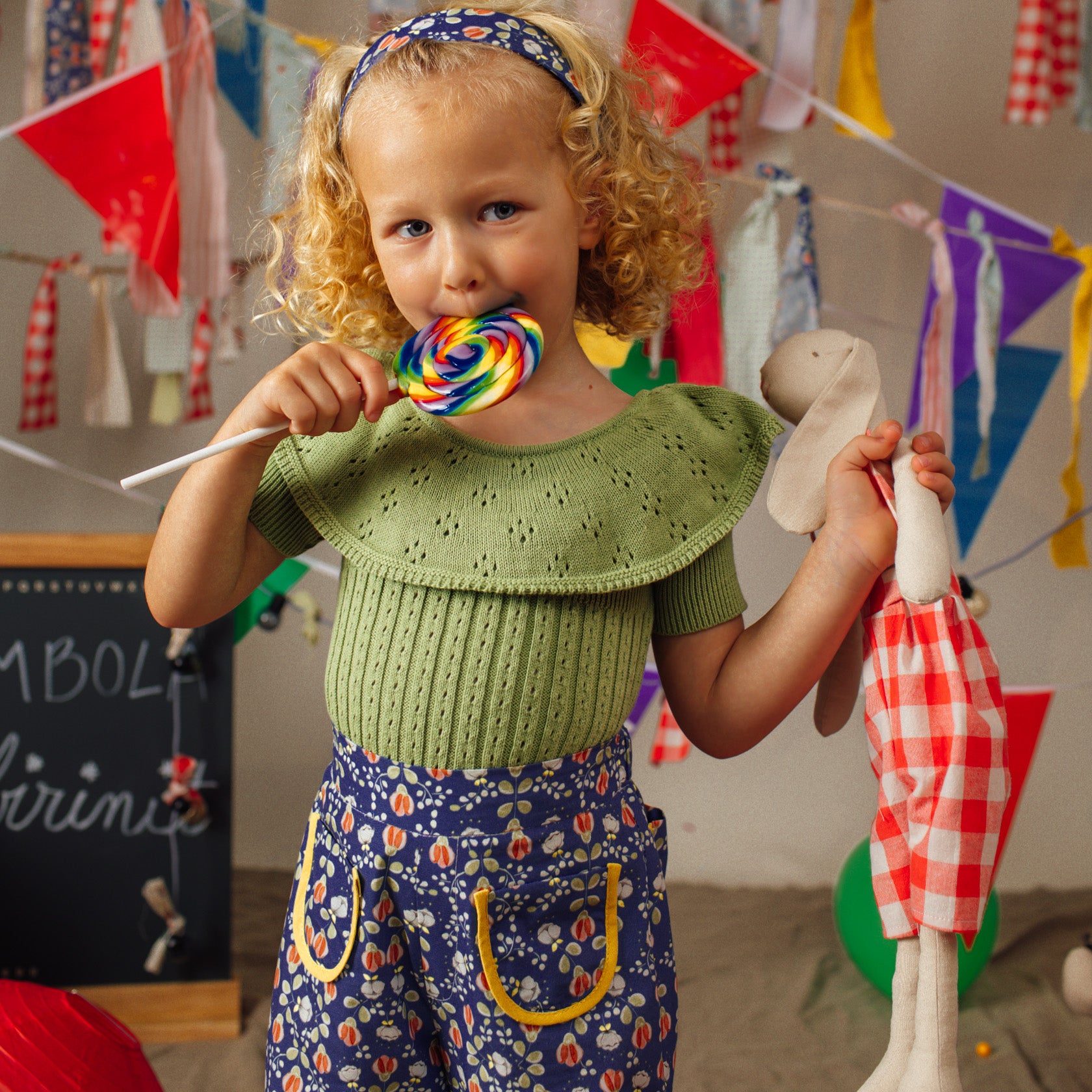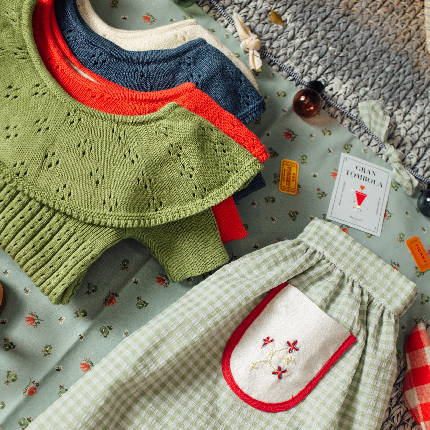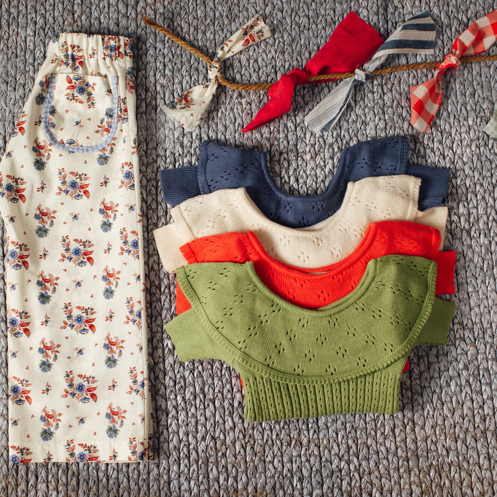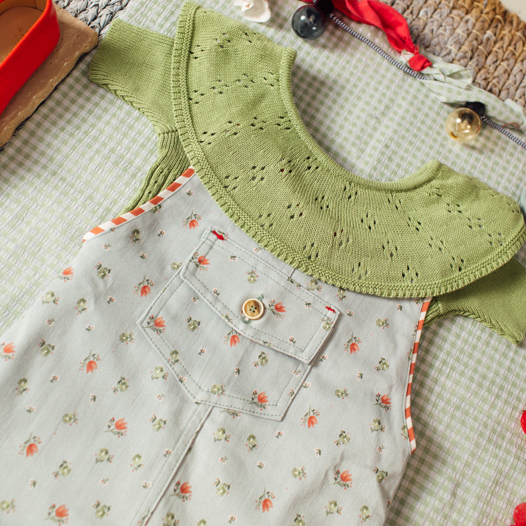 ピスタチオカラーのコットンサマーニット。大きな襟元がコーディネートのアクセントに。スカートやベルボトムパンツ、デニムなど色んなコーデを楽しめます。