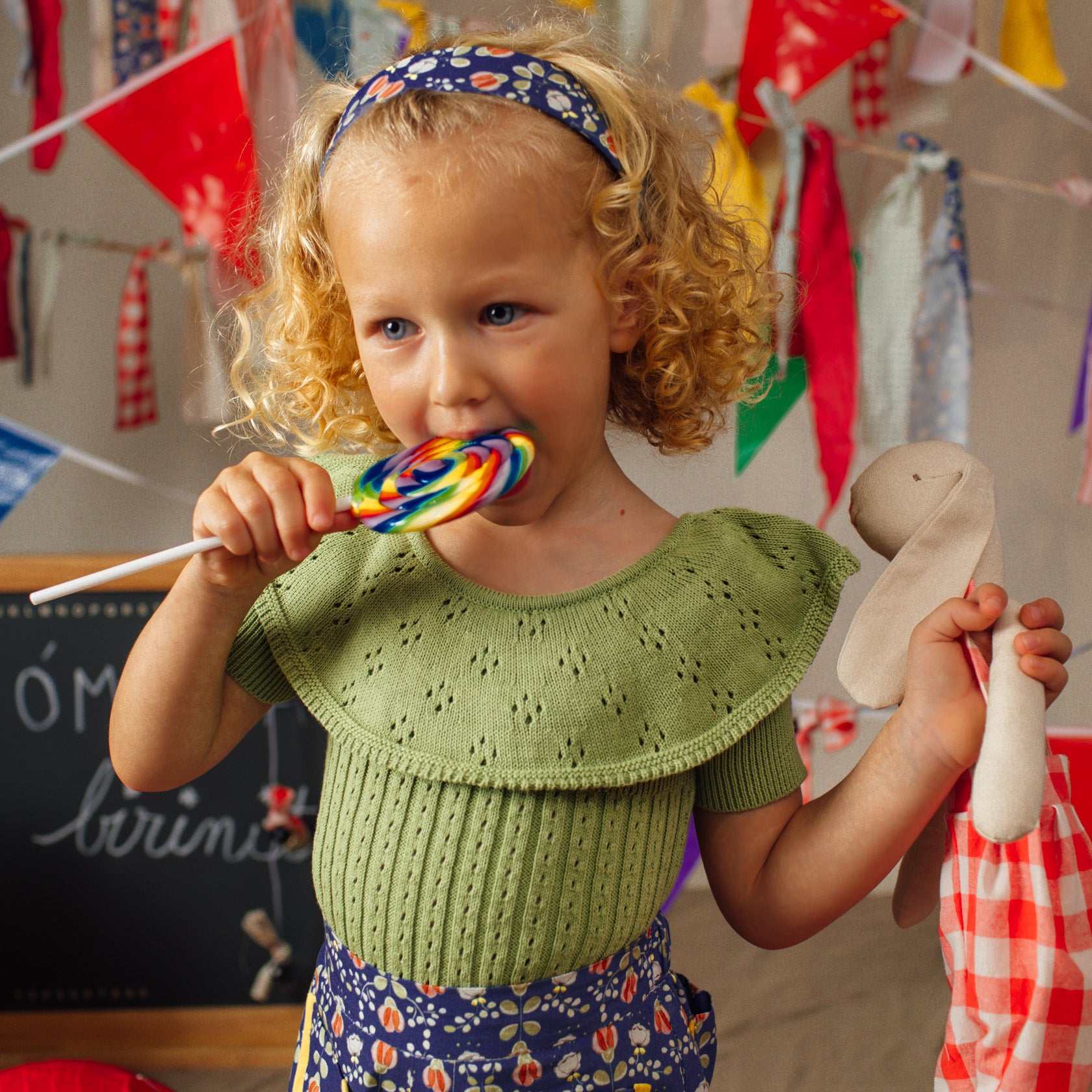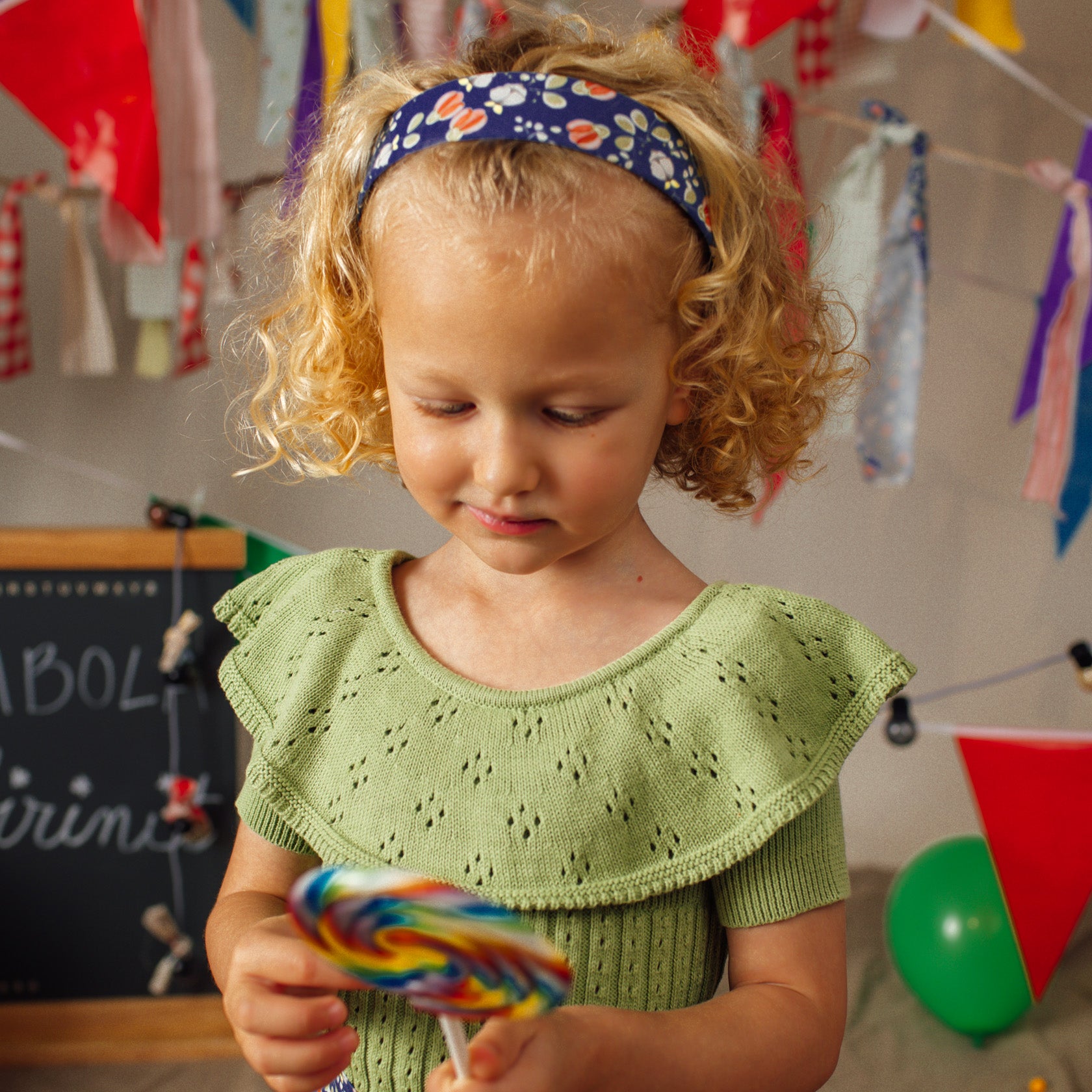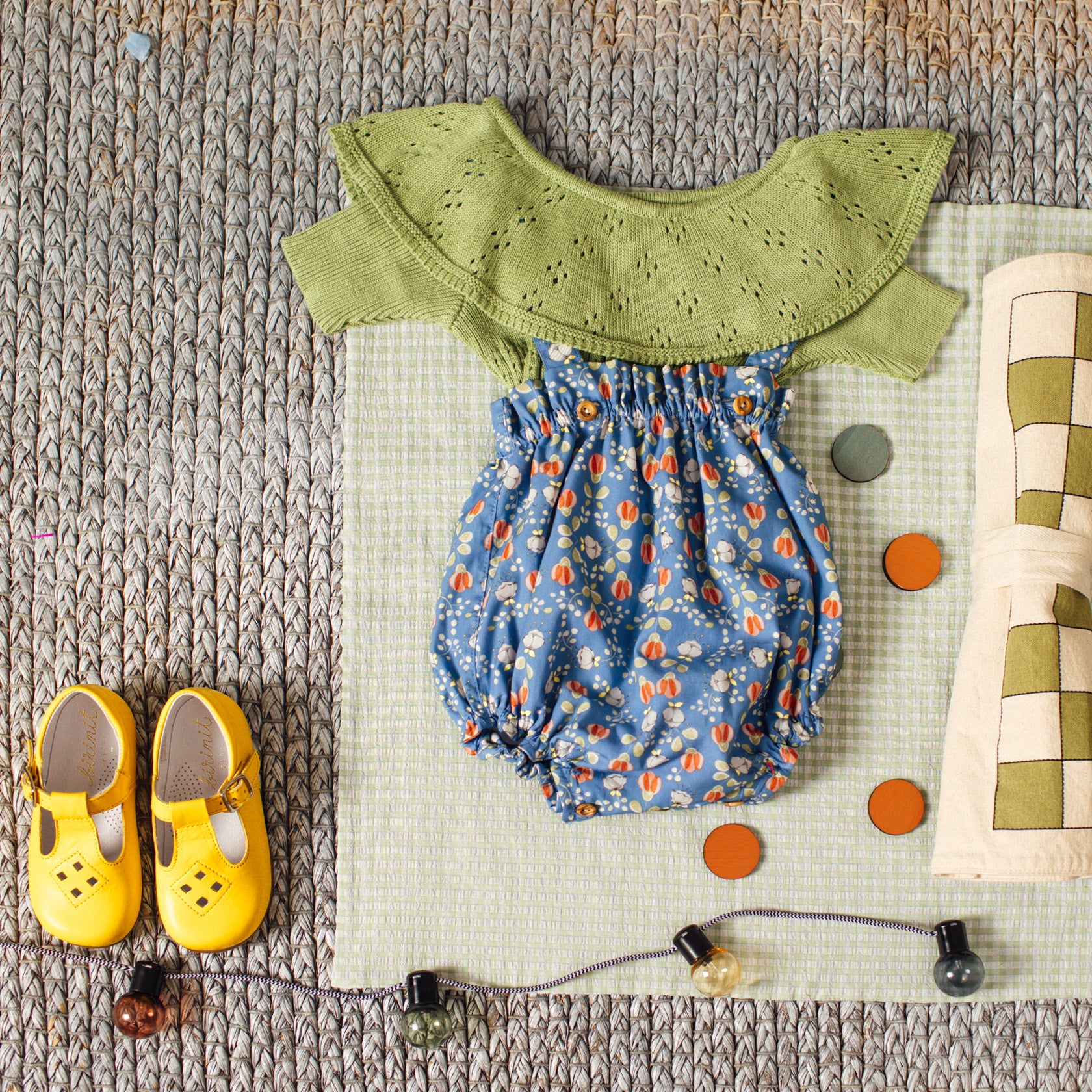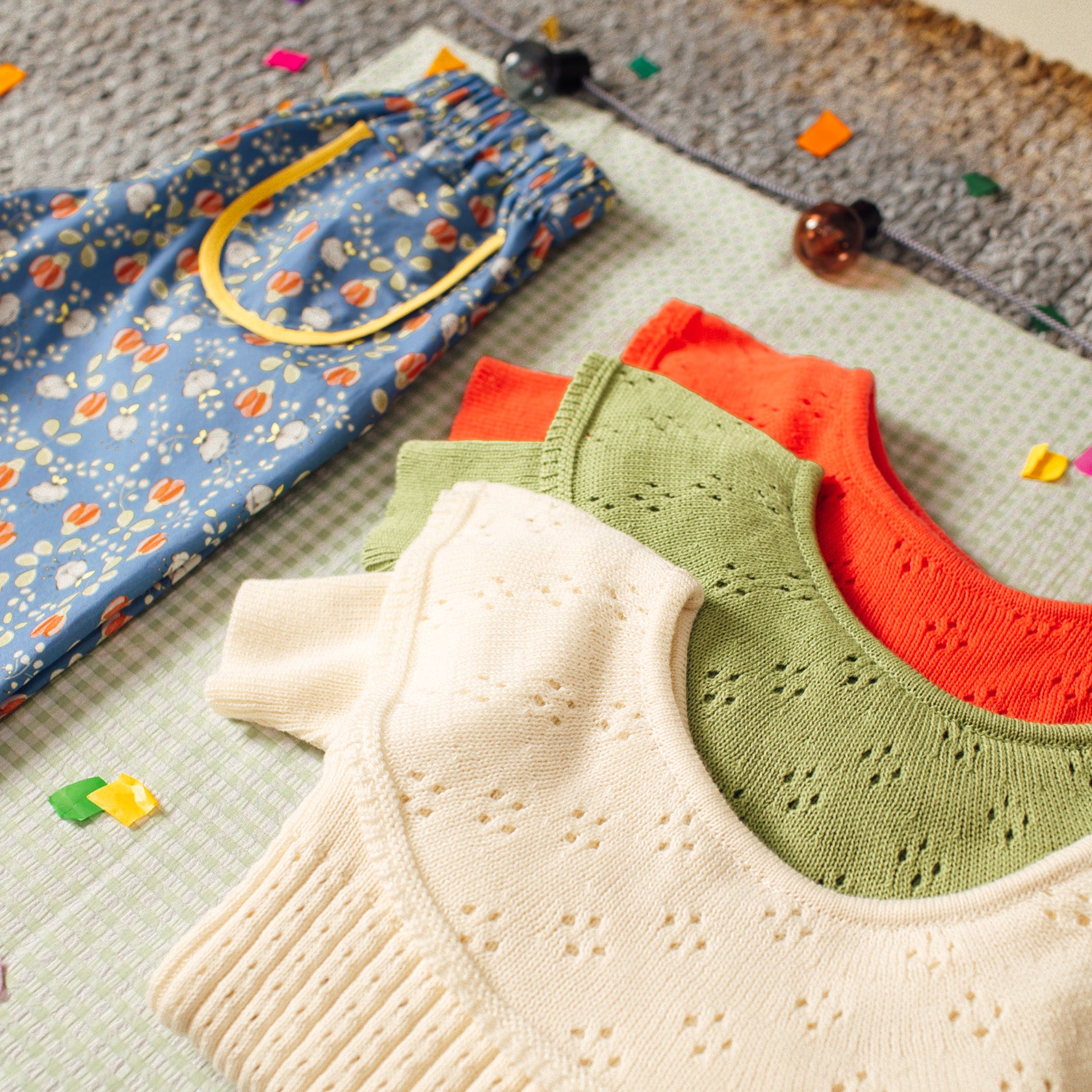 ピスタチオカラーのコットンサマーニット。大きな襟元がコーディネートのアクセントに。スカートやベルボトムパンツ、デニムなど色んなコーデを楽しめます。
