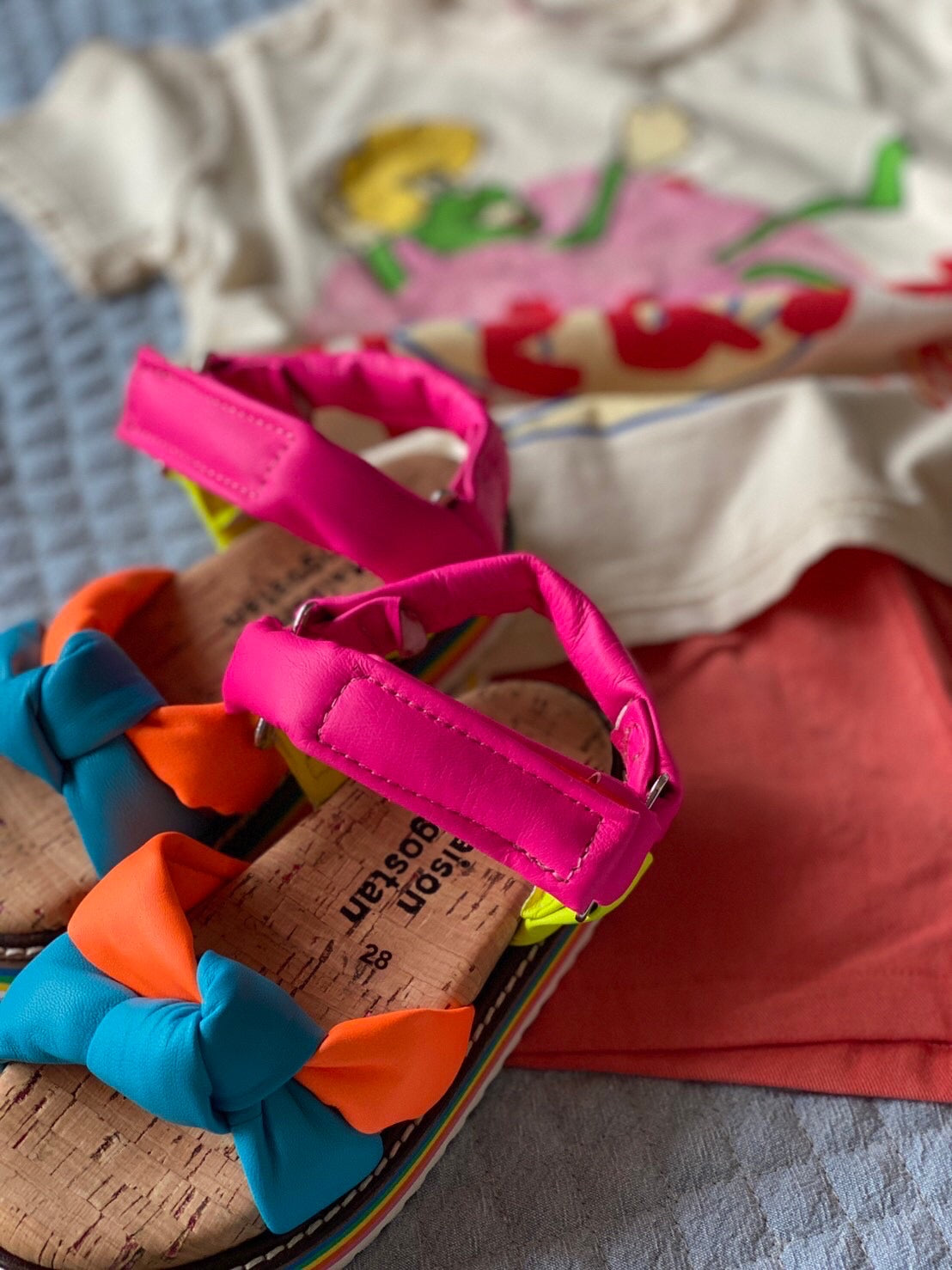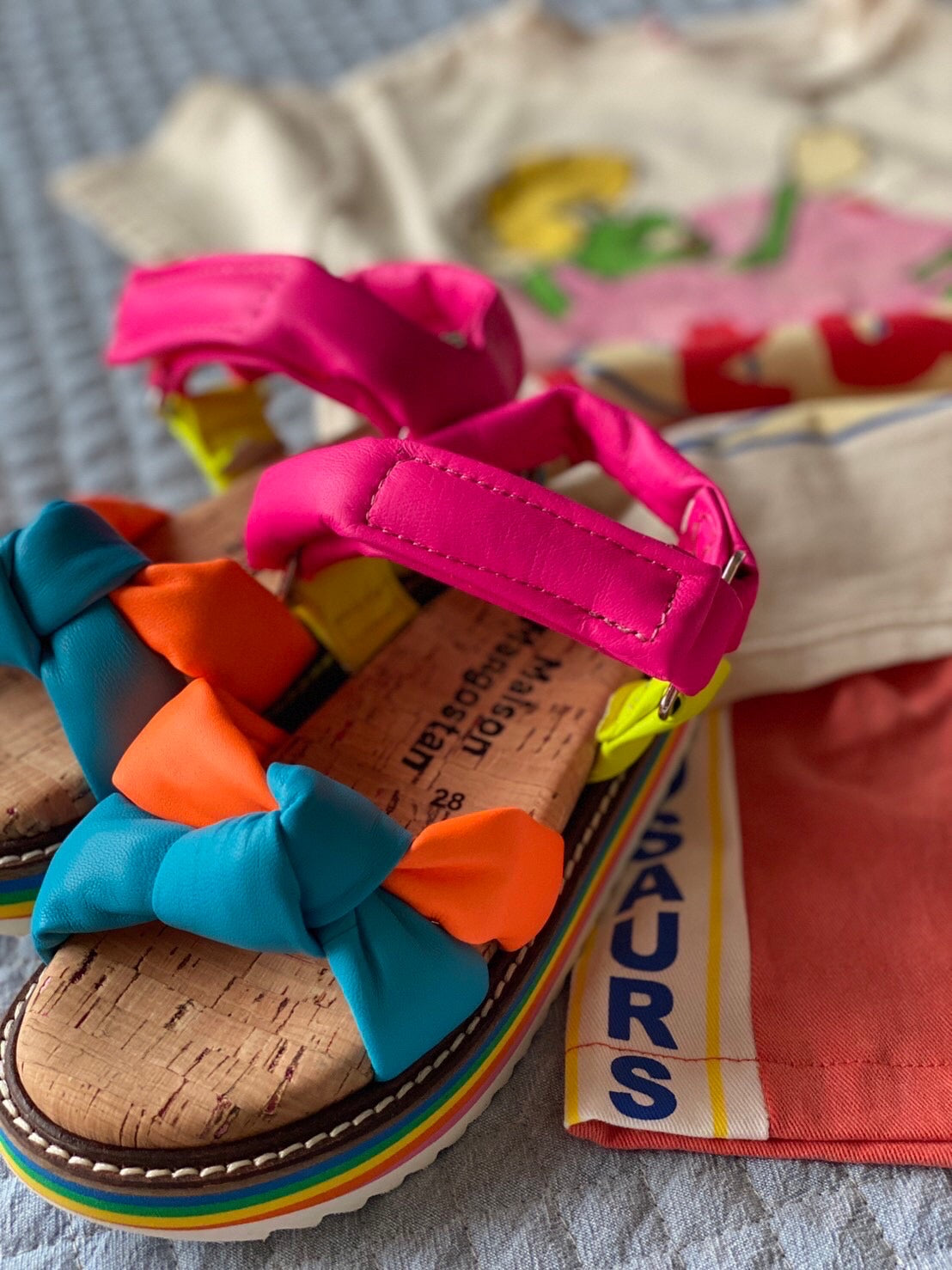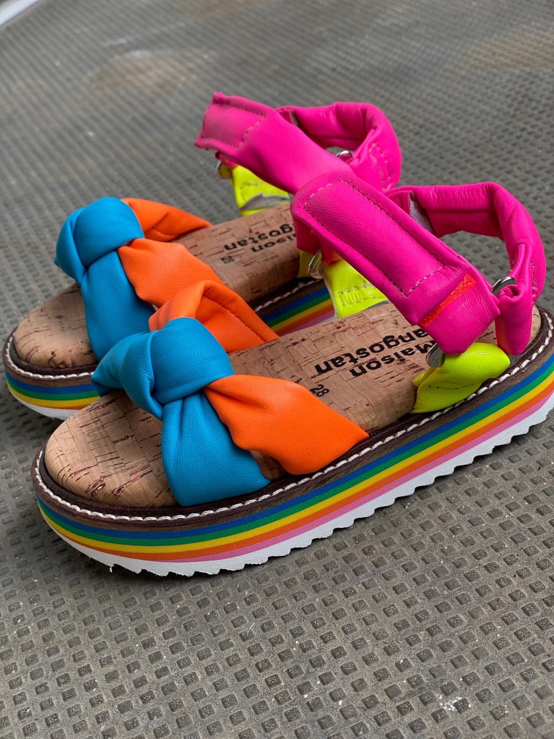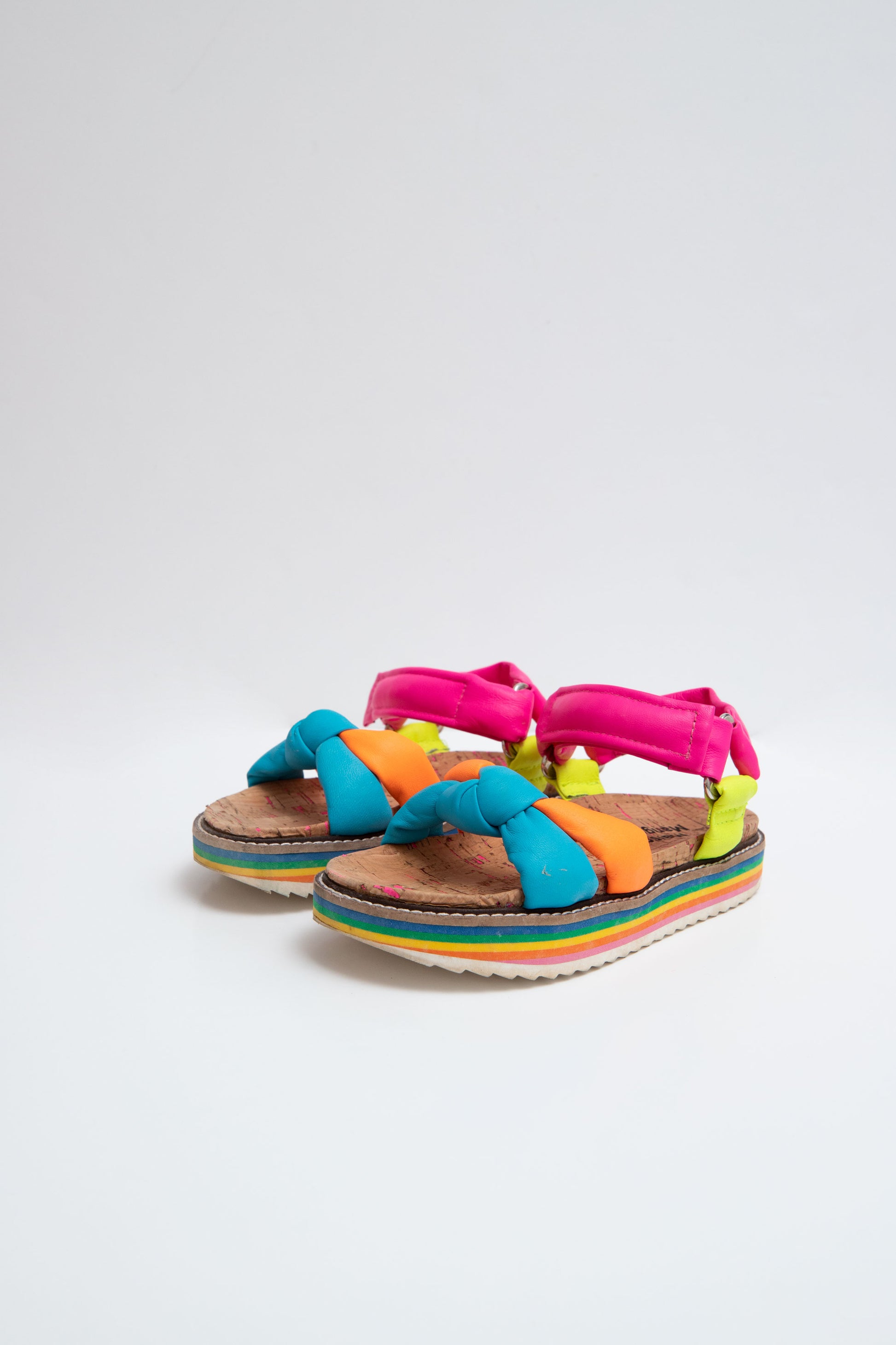カラフルな色合いと、クッションのようなパフッとしたストラップ部分がトレンド感ばっちりのサンダルです。レインボーのソール部分は少し高さがありますが、クッション性があるので長時間履いていても足が痛くなりにくいです。