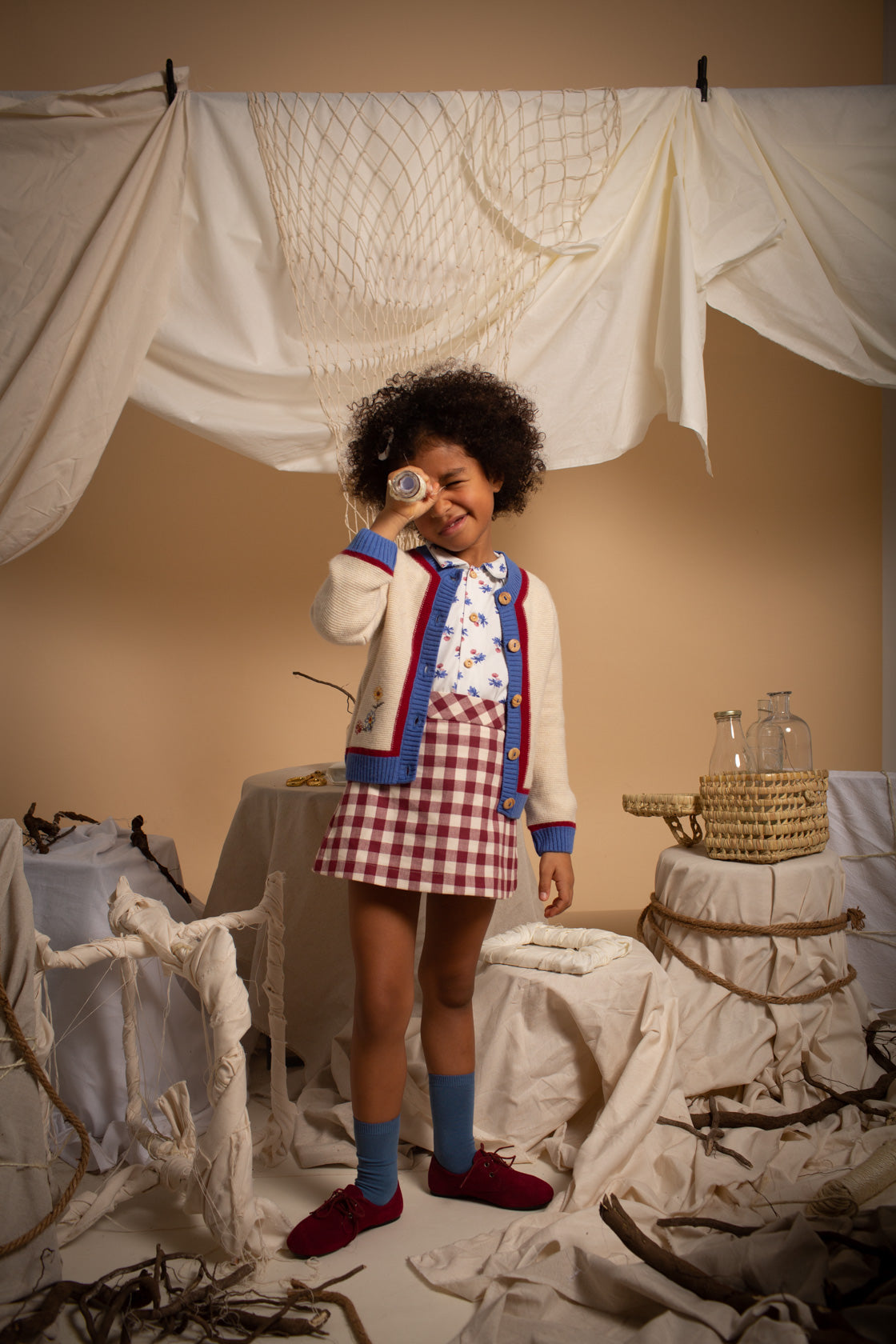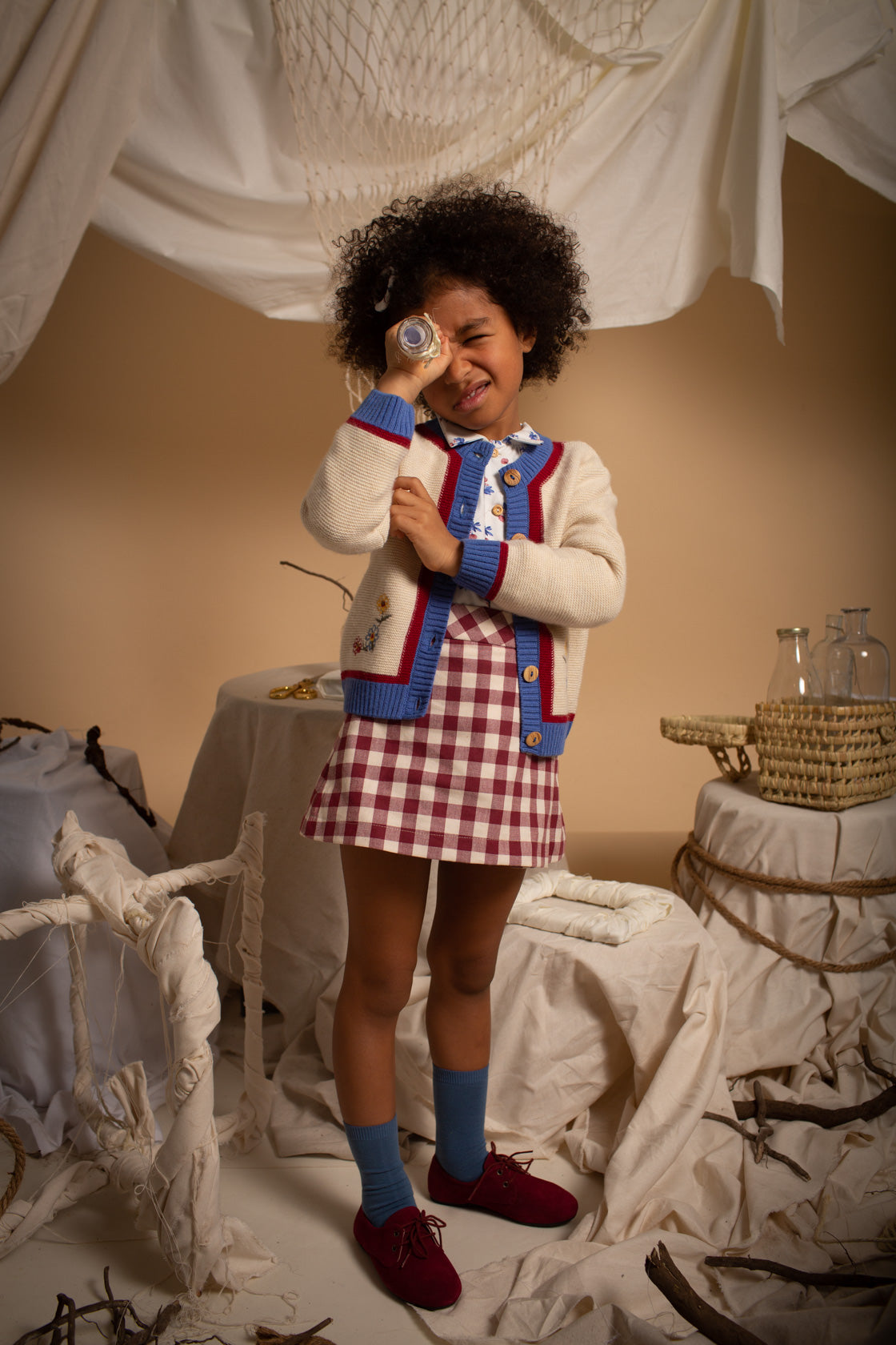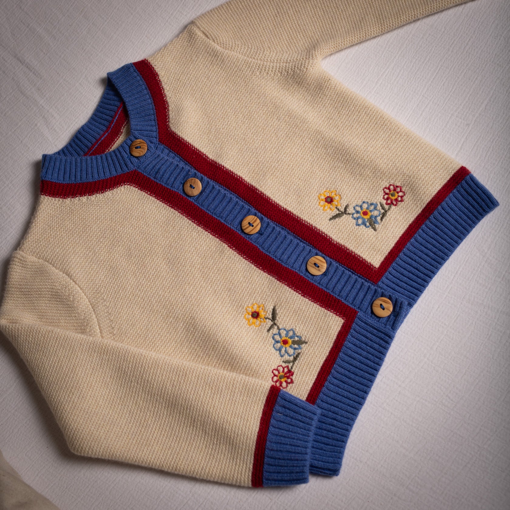 ちくちくしない柔らかい糸で編まれたメリノウールニット。少しコンサバなデザインが絶妙。スカートとのセットアップで着ても、単独で着ても可愛いく着回しのきくアイテム。涼しくなる秋口から冬本番まで活躍間違いなし。