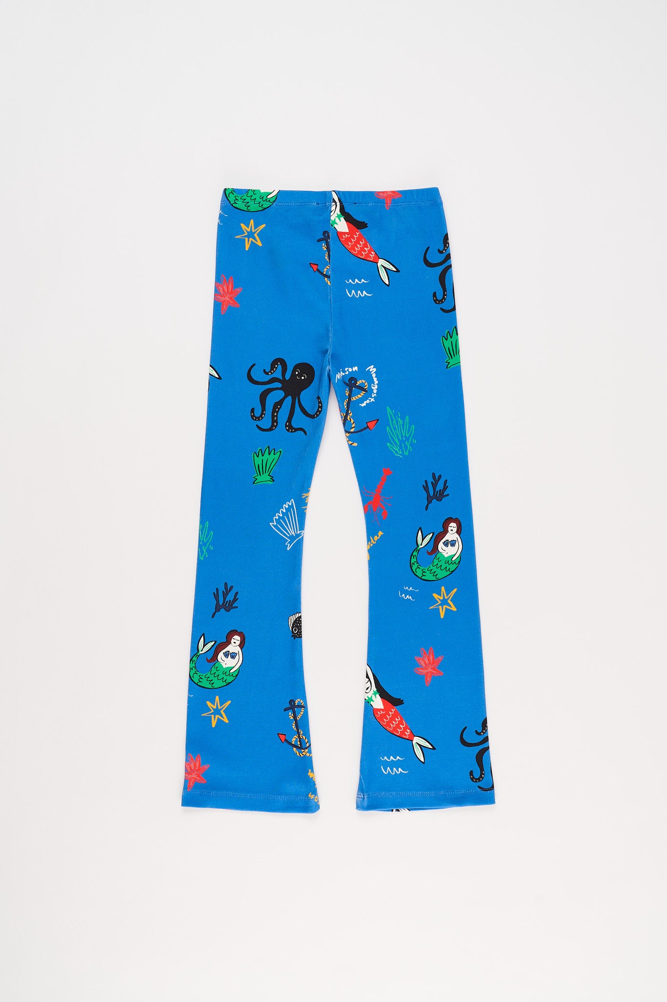 マーメードや海の生き物柄のレギンス。程よいハリがありつつ柔らかいオーガニックコットン素材で着心地よき。裾が広がるフレアタイプ。