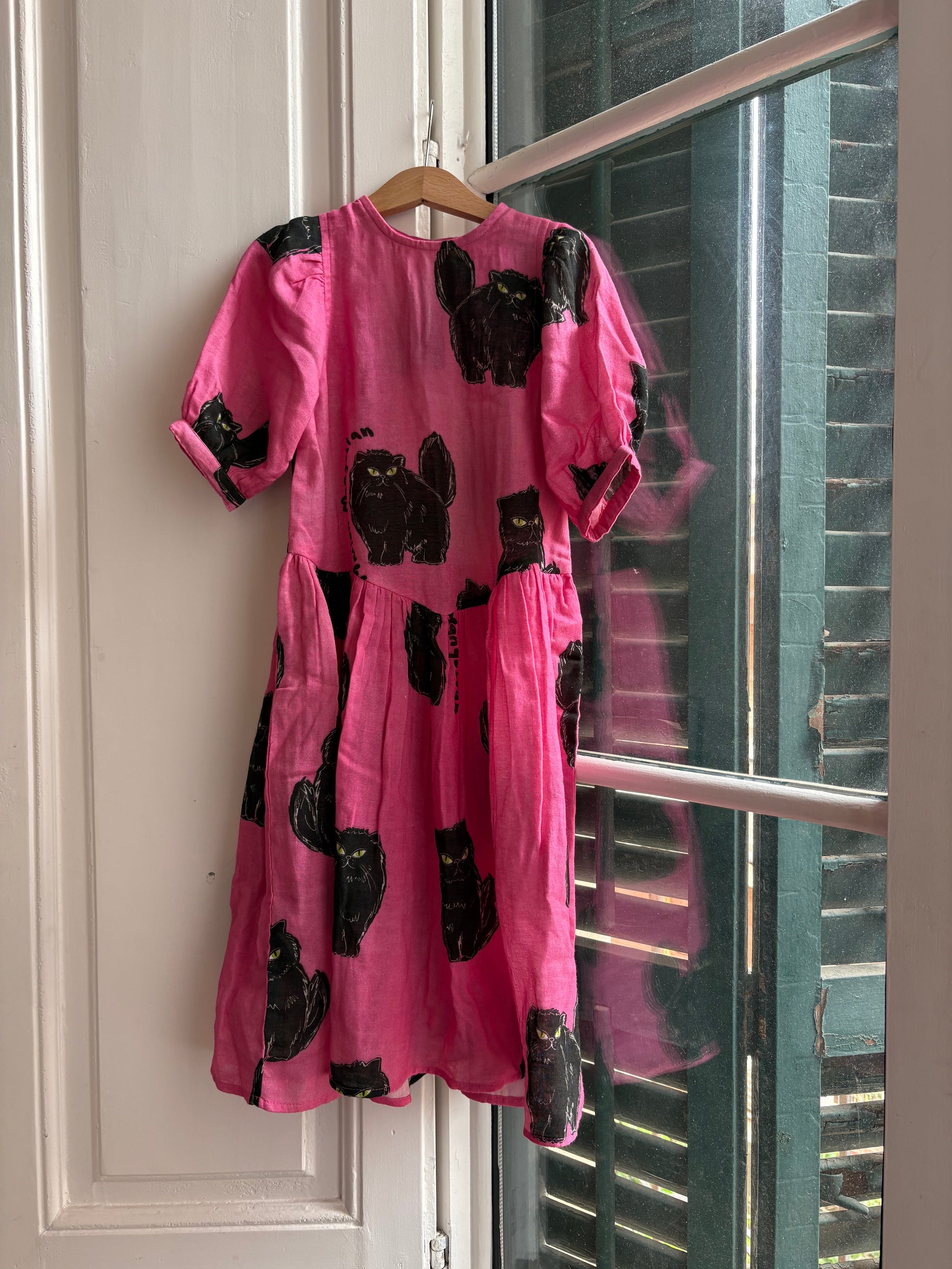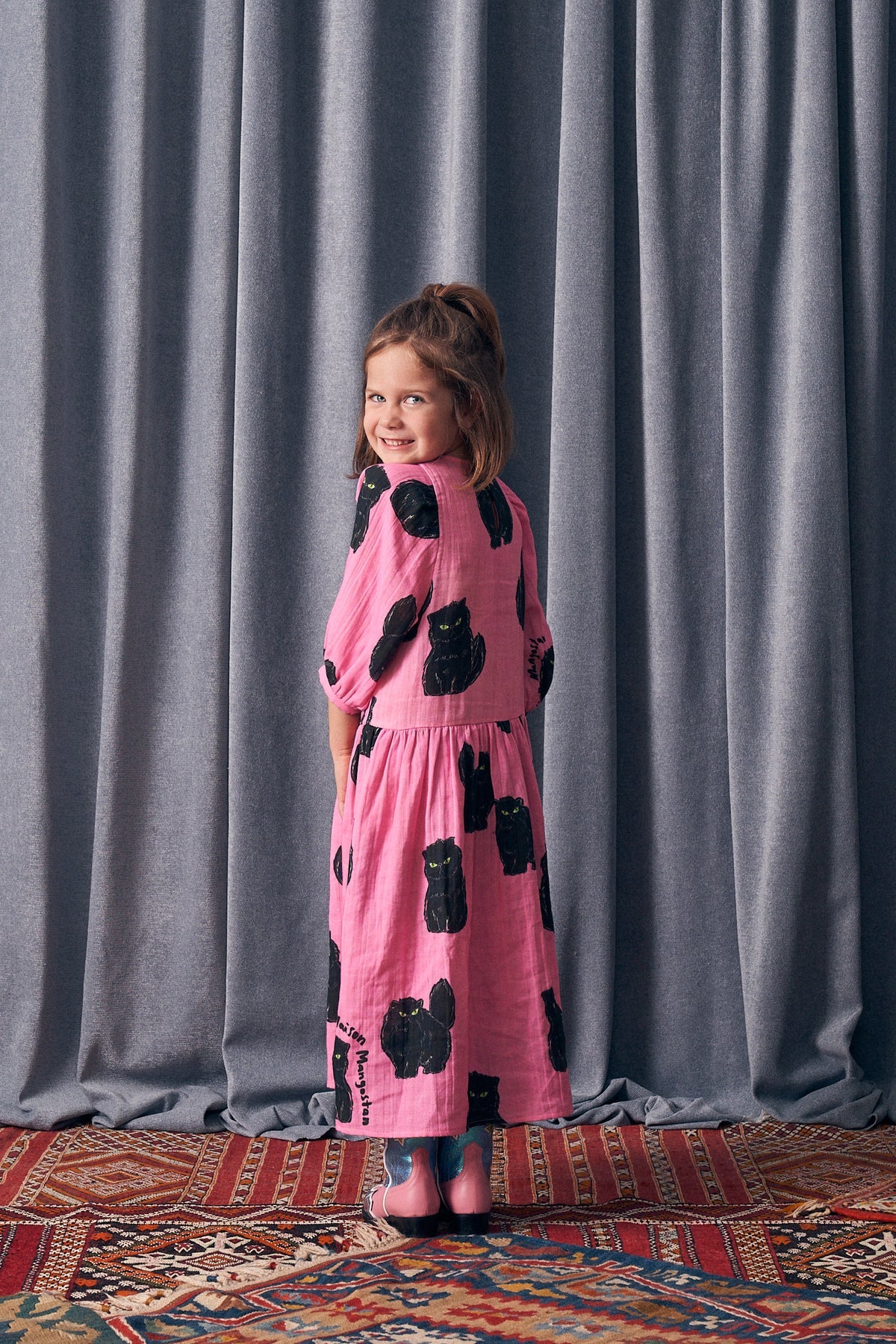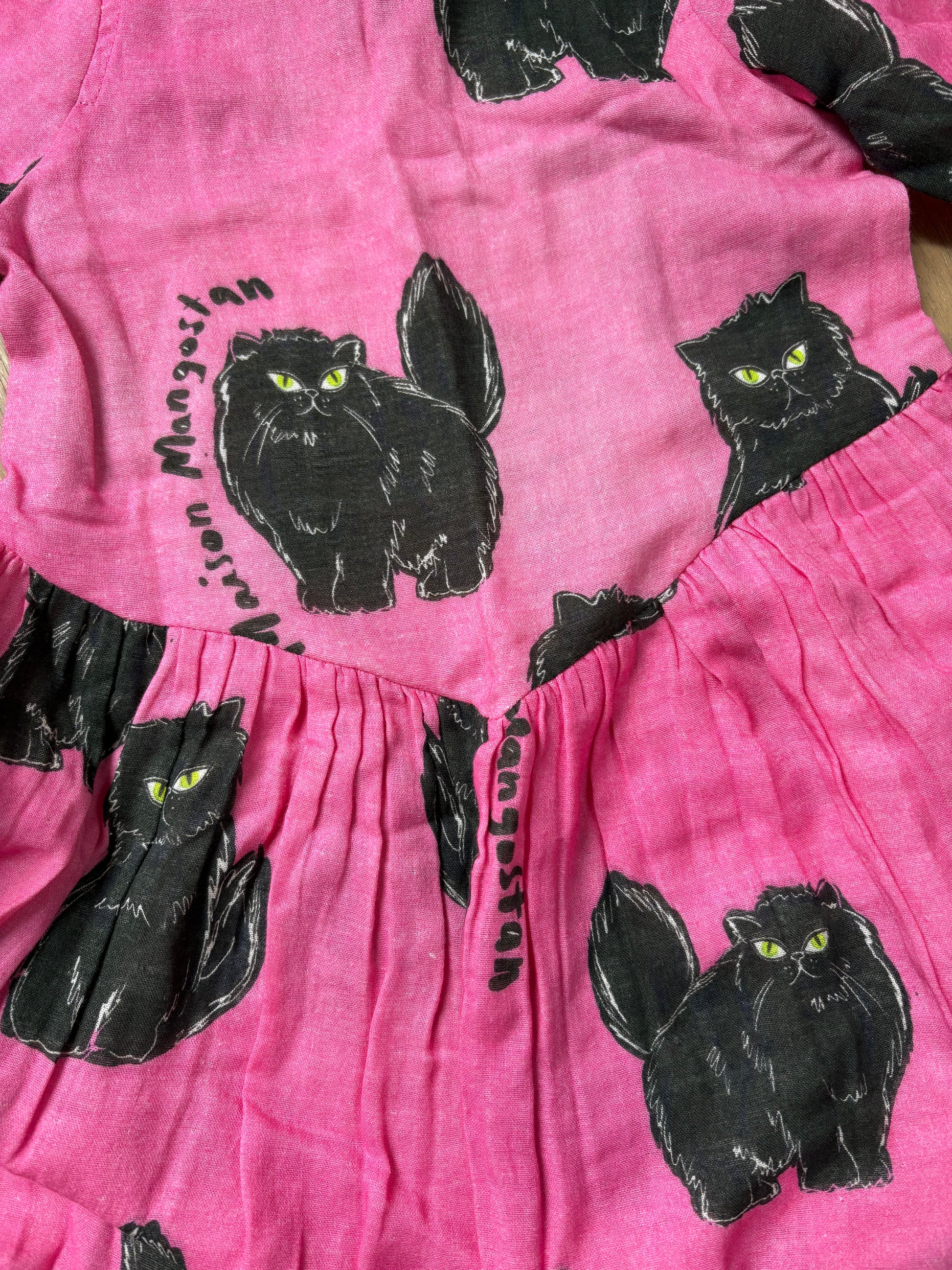 黒猫柄が可愛いピンクのドレス。薄手のコットン生地で少し透け感がありガーゼの肌触り。エアリーで軽く締め付け感もないのでリラックスして着用頂けます。