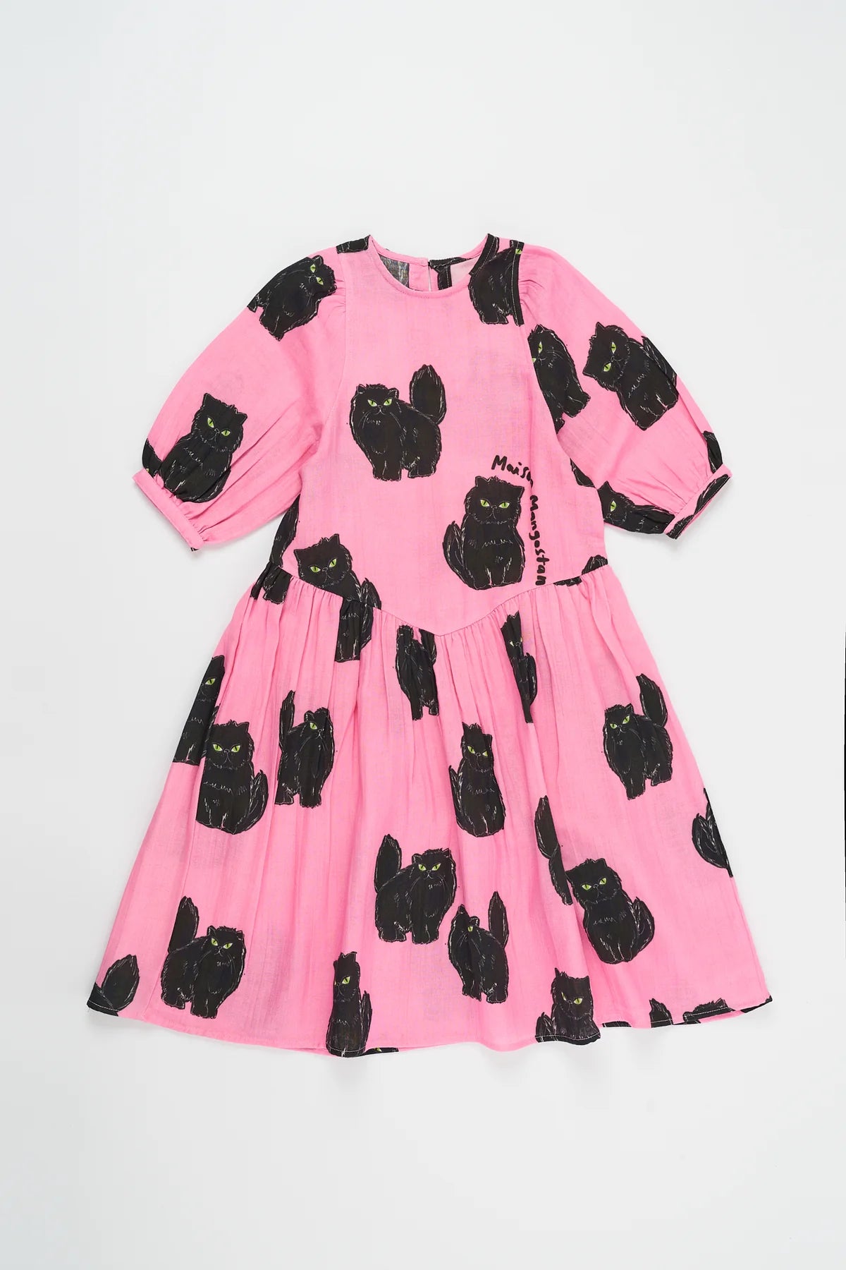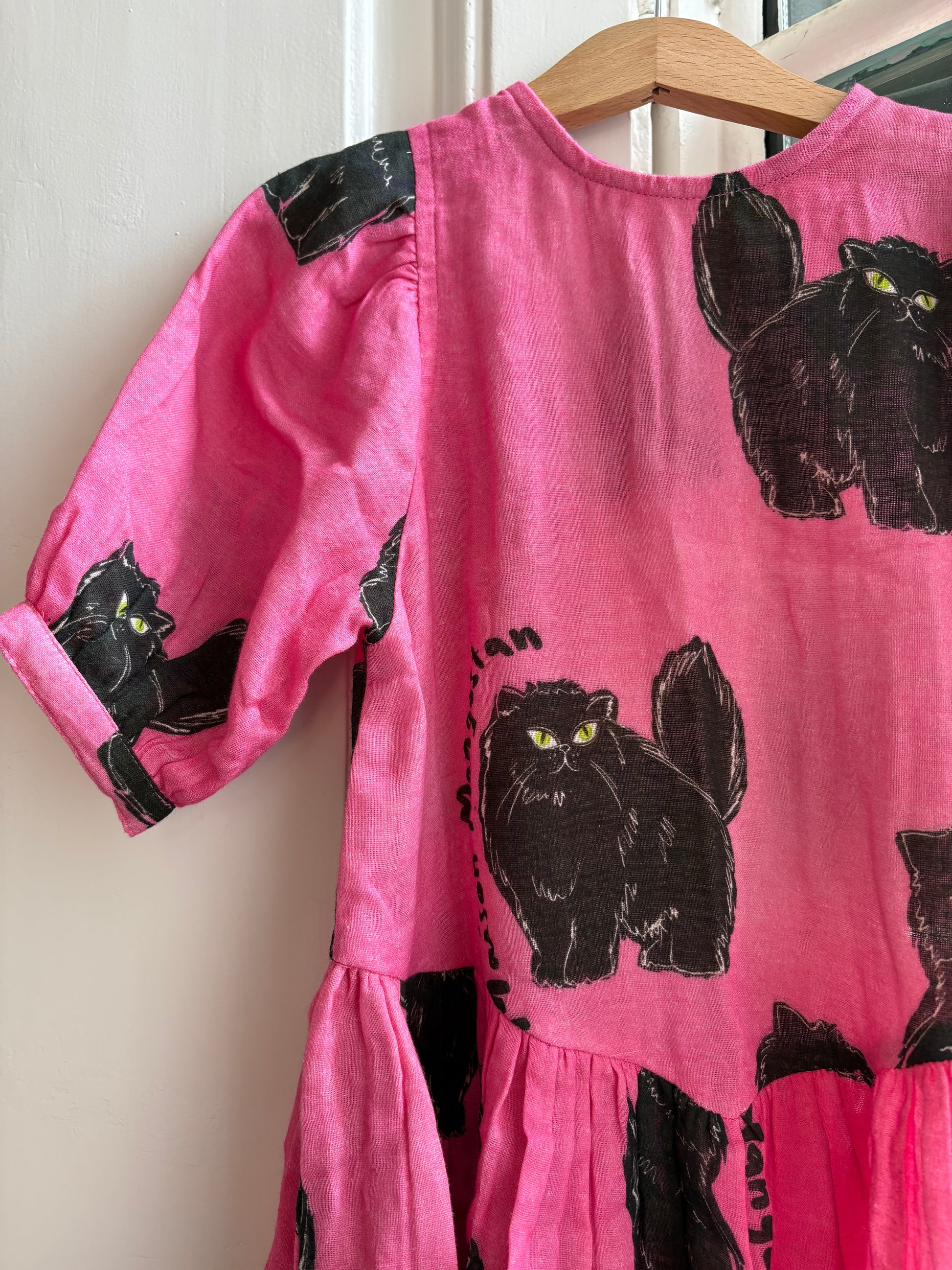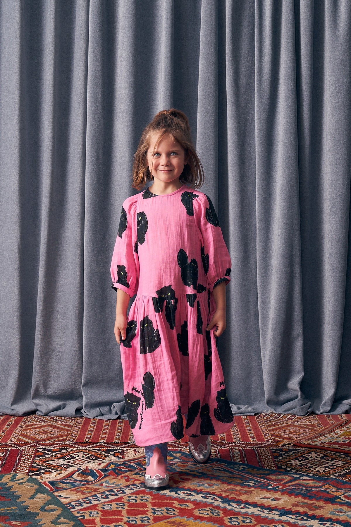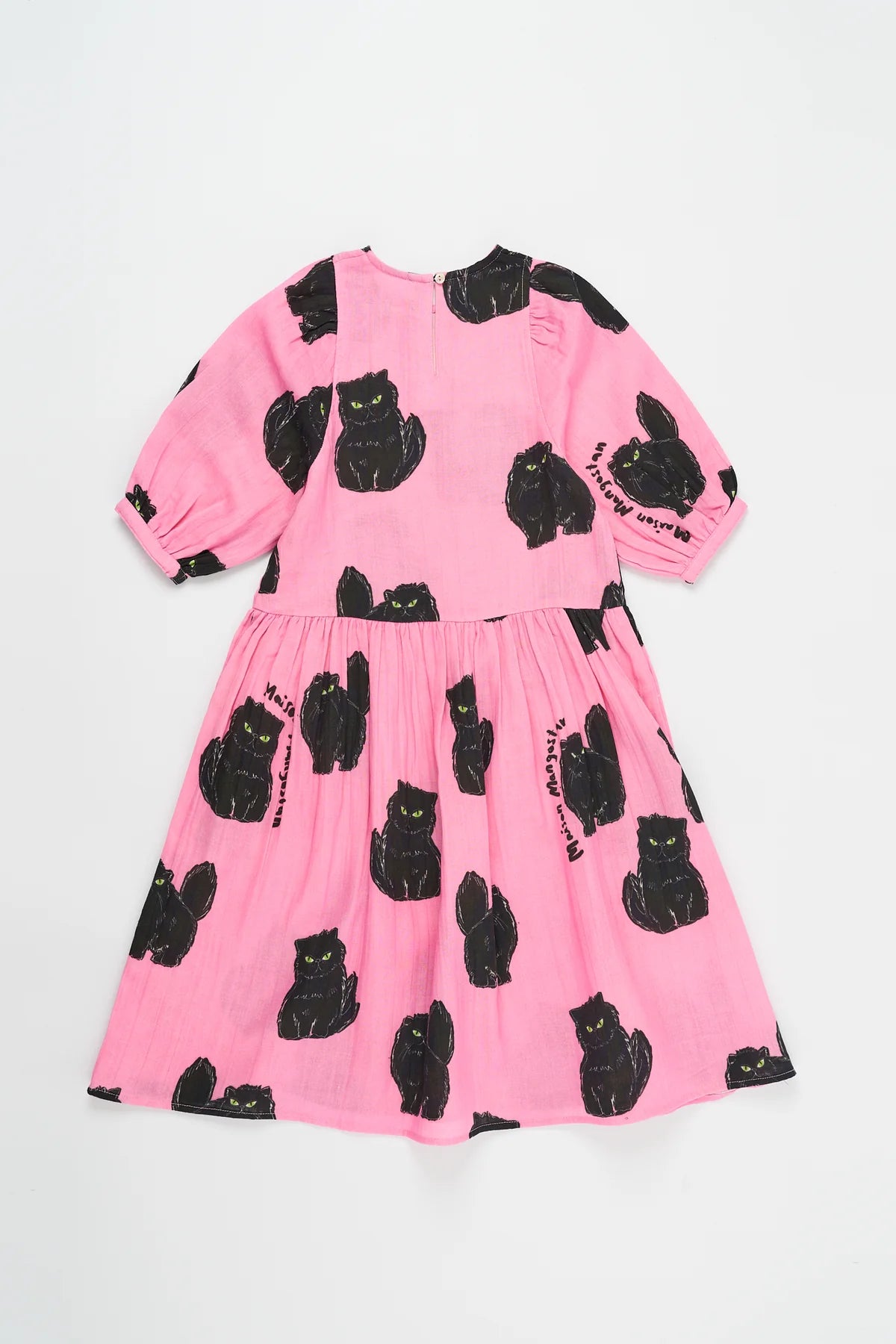 黒猫柄が可愛いピンクのドレス。薄手のコットン生地で少し透け感がありガーゼの肌触り。エアリーで軽く締め付け感もないのでリラックスして着用頂けます。
