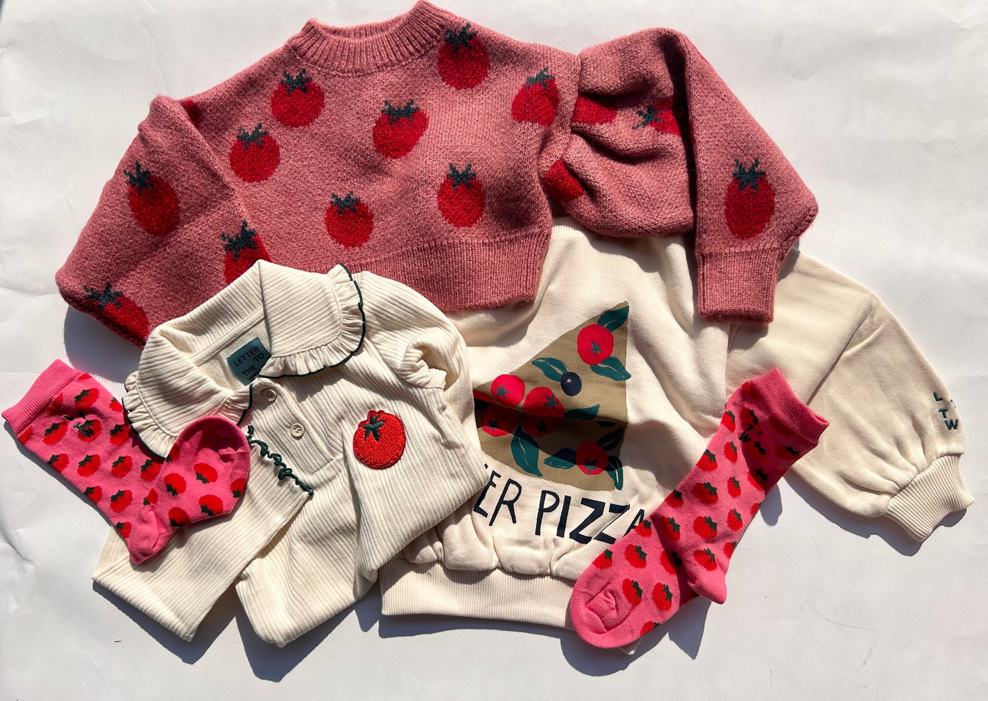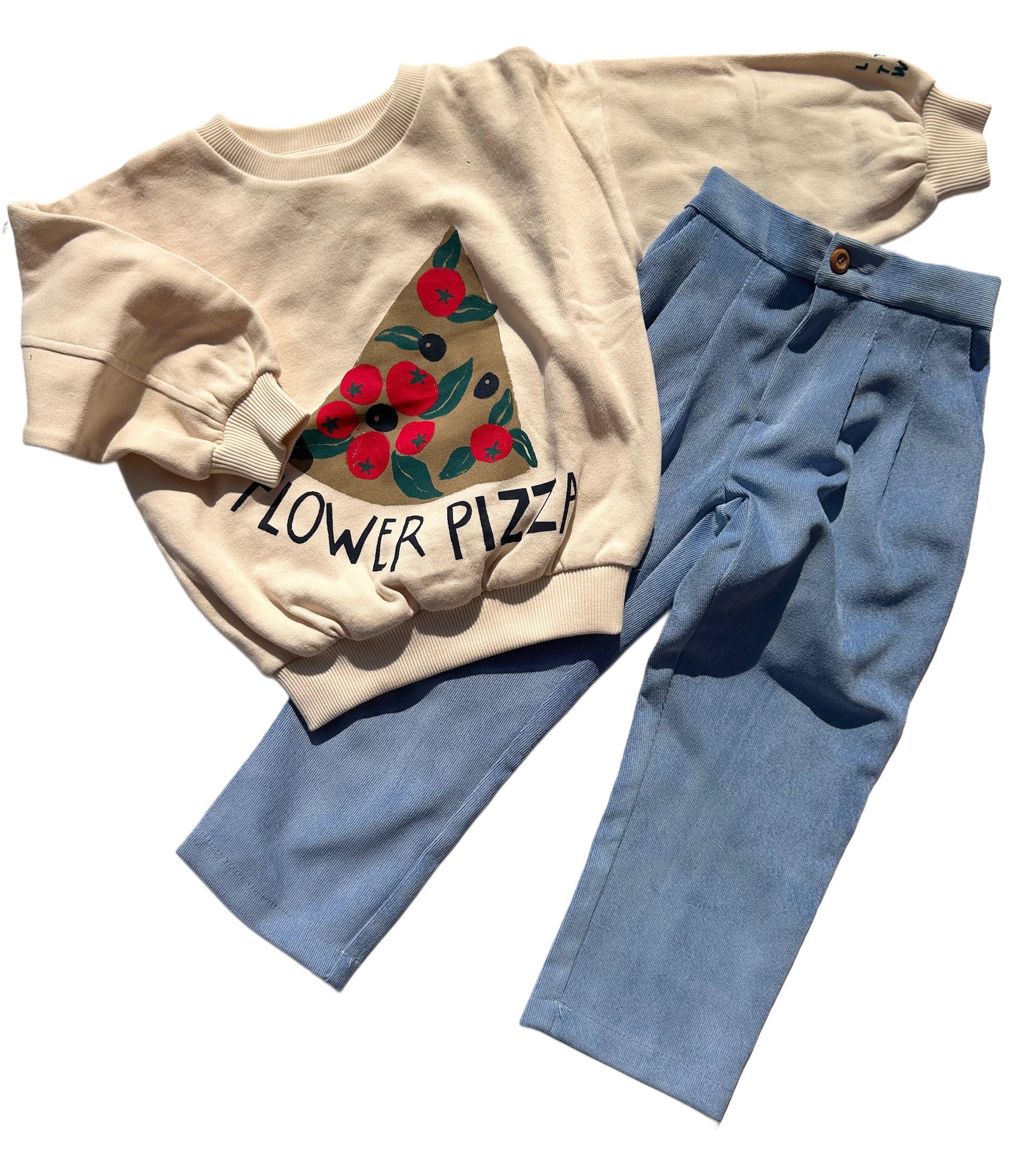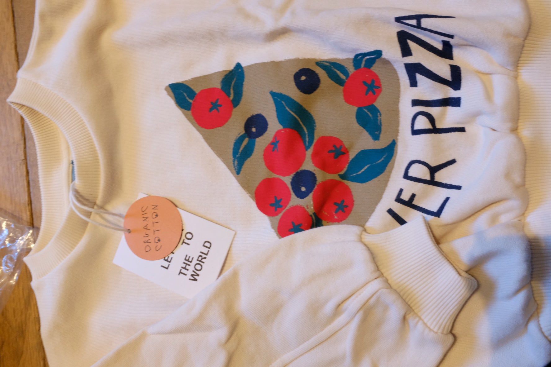 ピザプリントが可愛い、ふわっふわのオーガニックコットンスウェット。肌触りが最高なのでぜひ触ってみてほしい一着です。